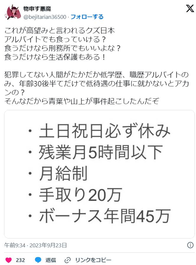 生活保護受給者「ハロワ行ってきた。『これは高望み』と言ってきた職員に『真面目に生きてる人間を追い詰めない方がいいよ、青葉真司になる覚悟はできてる』と釘刺しといた」