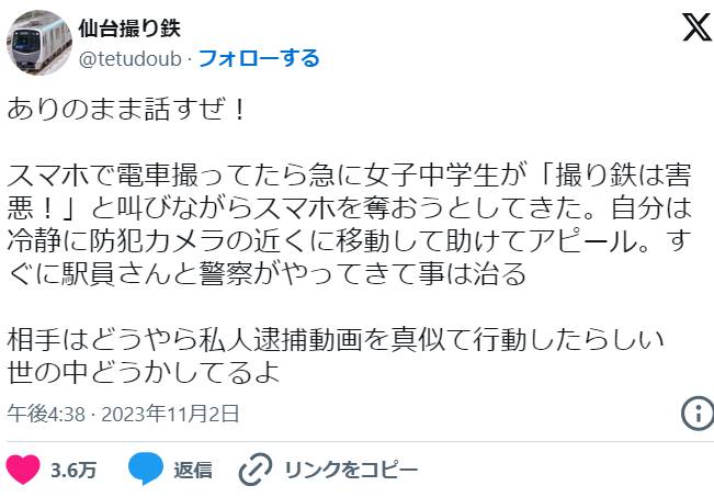撮り鉄「スマホで電車撮影していたら、急に女子中学生が「撮り鉄は害悪!」と叫びながらスマホを奪おうとしてきた!駅員と警察が来たら、事は治った」