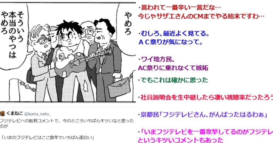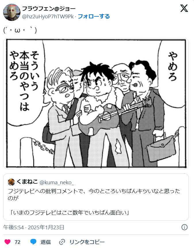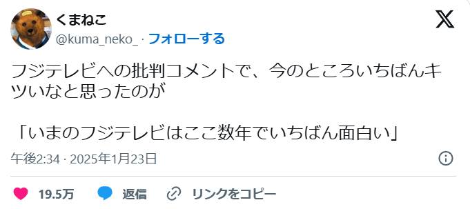 【ほんとそれ】「フジテレビへの批判コメントで、今のところいちばんキツいなと思ったのコレ」 → 言ってはいけない真実すぎて19万いいねwwwww