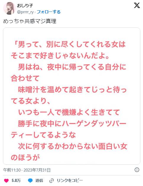 「男って味噌汁を温めて帰りを待ってる”尽くす女”より、夜中にハーゲンダッツパーティするような“おもしれー女”が好きなんだよ」→5万いいね超え
